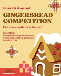 The 4th annual AHS Gingerbread House Competition is sure to make this holiday season extra sweet. Gingerbread artists of all ages are invited to compete for prize ribbons in several unique categories. Contact us at annapolisheritage@gmail.com or 902-532-7754 to learn more.